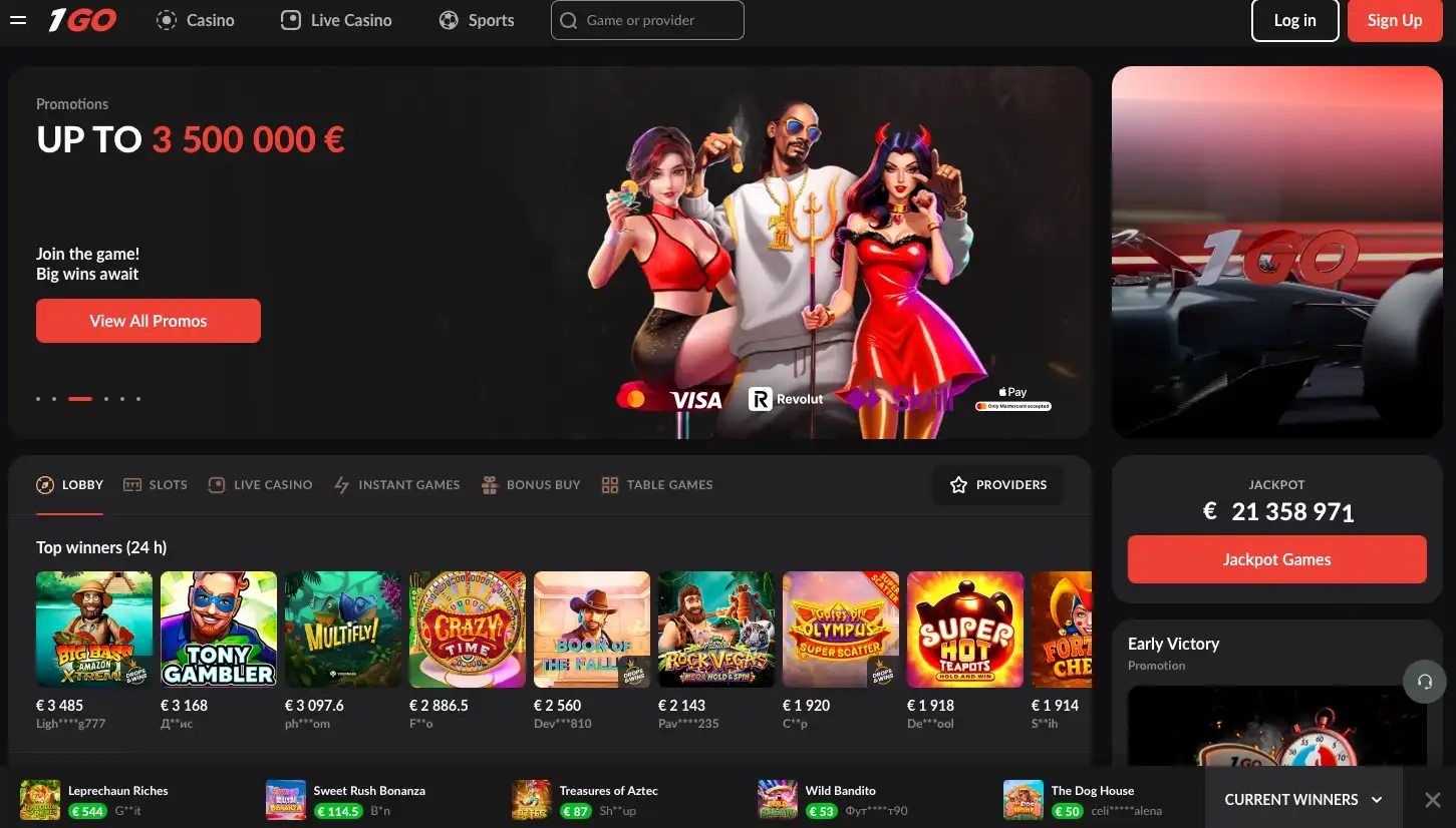 1Go Casino piedāvā 600 eiro + 400 bezmaksas griezienus starta bonusā, pilnīgi visiem jauniem spēlētājiem. Zemāk links, kas nav ar bloķētu pieeju no Latvijas un bez VPN nepieciešamības ⬇️