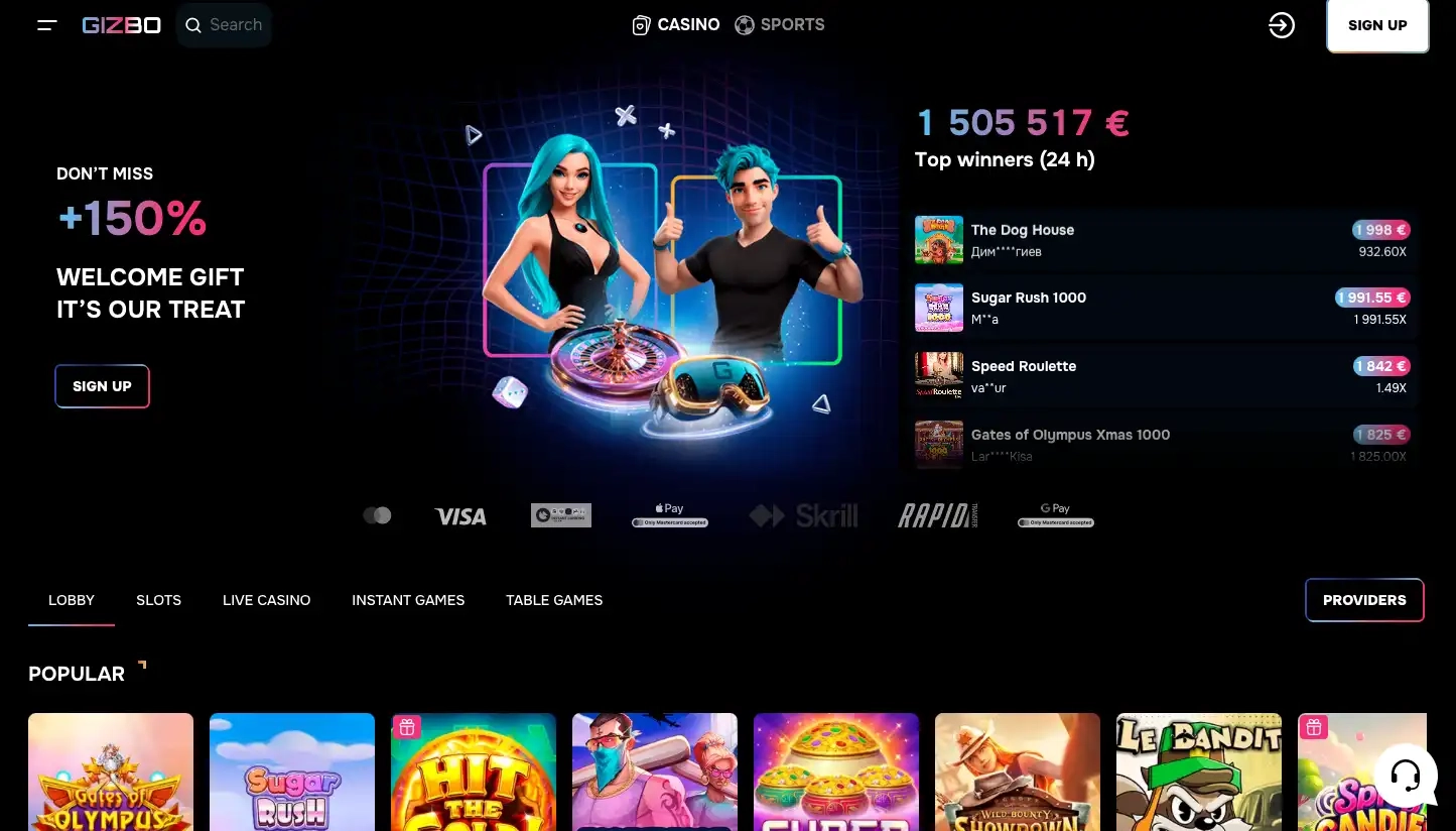 Gizbo Casino piedāvā 600 eiro + 600 bezmaksas griezienus starta bonusā, pilnīgi visiem jauniem spēlētājiem. Zemāk links, kas nav ar bloķētu pieeju no Latvijas un bez VPN nepieciešamības ⬇️