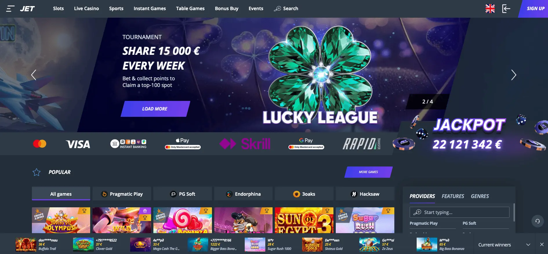 Jet Casino izceļas ar savu moderno dizainu, intuitīvo navigāciju un plašo spēļu bibliotēku, kurā ietilpst vairāk nekā 6000 spēles. Spēlētāji var izbaudīt ne tikai tradicionālos spēļu automātus, bet arī galda spēles, tiešraides kazino, sporta totalizatoru un pat e-sporta derības. Platforma ir pieejama vairākās valodās, tostarp angļu, krievu un citās, lai gan latviešu valodas atbalsts pagaidām nav pilnībā attīstīts. Tomēr mājaslapa ir optimizēta gan datoriem, gan mobilajām ierīcēm, nodrošinot nevainojamu pieredzi neatkarīgi no izmantotās platformas.