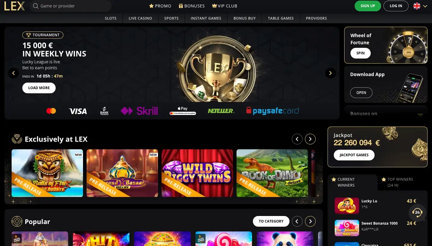 Lex Casino piedāvā 600 eiro + 400 bezmaksas griezienus starta bonusā, pilnīgi visiem jauniem spēlētājiem. Zemāk links, kas nav ar bloķētu pieeju no Latvijas un bez VPN nepieciešamības ⬇️