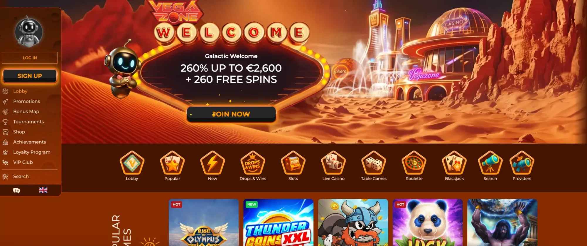VegaZone Casino piedāvā 2600 eiro un 260 bezmaksas griezienus jaunajiem spēlētājiem! Reģistrējies platformā, veic pirmo iemaksu un saņem iespaidīgu bonusu komplektu.